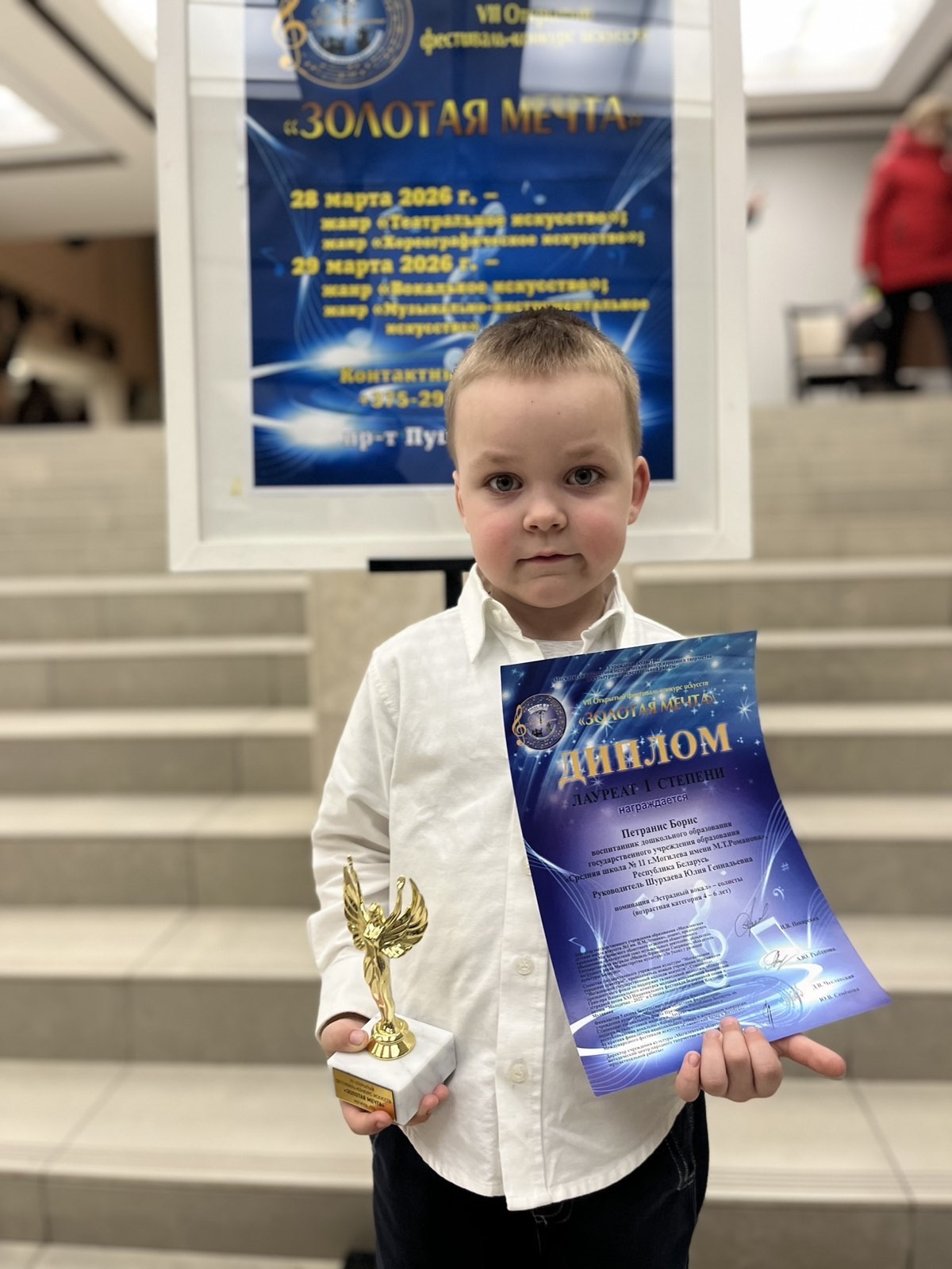Поздравляем воспитанника разновозрастной группы №6 Петраниса Бориса и музыкального руководителя Шурхаеву Юлию Геннадьевну с дипломом первой степени в фестивале-конкурсе "Золотая мечта"!